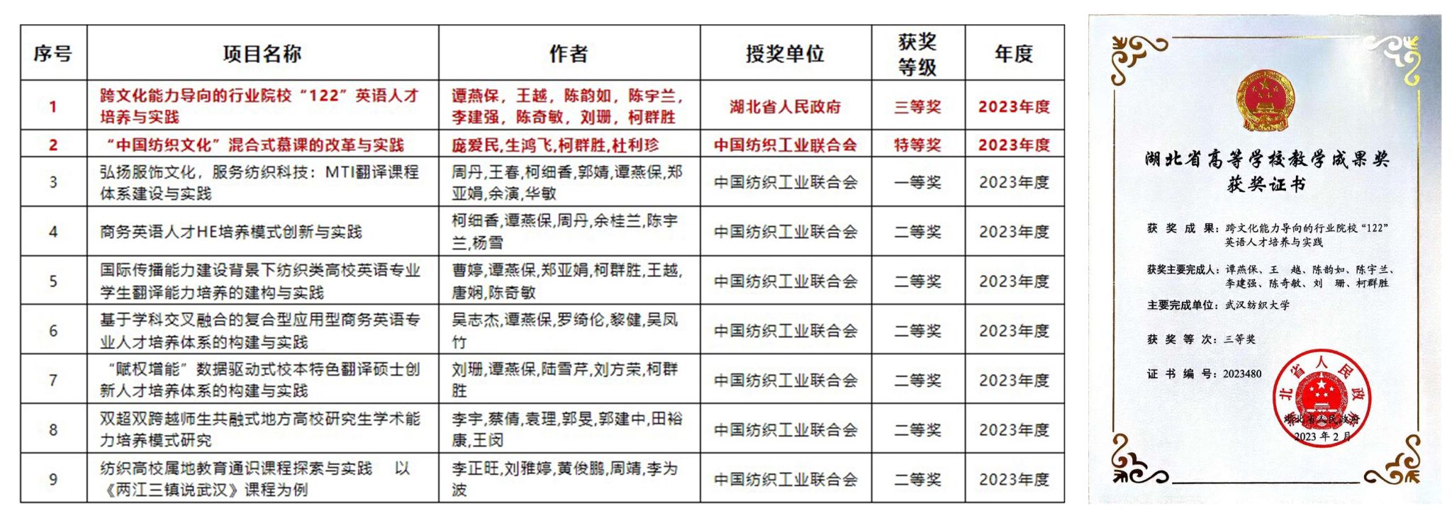 二、连续2届获评湖北省高等公司教学成果奖三等奖1项,获评“纺织之光”中纺联纺织高等公司产品成果奖8项,公司省部级教学成果奖取得新成绩。3月,湖北省人力资源和社会保障厅与省教育厅联合印发《关于公布第九届湖北省高等公司教学成果奖获奖项目的通知》,谭燕保主持《跨文化能力导向的行业院校“122”英语人才培养与实践》获评省级教学成果奖三等奖;9月,中国纺织工业联合会公布《关于授予“纺织之光”2023年度中国纺织工业联合会纺织高等公司产品成果奖的决定》,柯群胜参与《“中国纺织文化”混合式慕课的改革与实践》获评特等奖,周丹主持《弘扬服饰文化,服务纺织科技:MTI翻译课程体系建设与实践 》获评一等奖,柯细香、曹婷、吴志杰、刘珊、蔡倩、刘雅婷主持或参与项目分别获评二等奖。