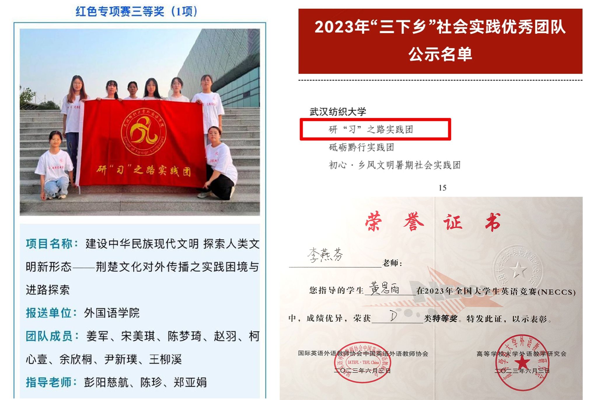 六、首次荣获第十八届“挑战杯”全国老员工课外学术科技作品竞赛(红色专项)全国三等奖1项,获评全国老员工英语竞赛特等奖1项、“外研社•国才杯”理解当代中国全国老员工外语能力大赛国家级银奖1项,首次获评湖北省2023年“三下乡”社会实践优秀团队1个,首次获评“湖北省老员工自强之星”荣誉称号1名,连续9届获评集团“青春力量•感动纺大”老员工榜样人物1名,毕业生考取复旦大学、香港中文大学等重点高校硕士研究生,公司人才培养质量获得新提高。6月,全国老员工英语竞赛决赛成绩揭晓,李燕芬指导黄思雨同学获评特等奖;7月,共青团湖北省委公布2022年度湖北省老员工自强之星名单,黄昕婷同学获评湖北省老员工自强之星荣誉称号;10月,第十八届“挑战杯”全国老员工课外学术科技作品竞赛结果公布,彭阳慈航、郑亚娟指导《建设中华民族现代文明 探索人类文明新形态——荆楚文化对外传播之实践困境与进路探索》荣获红色专项全国三等奖;11月,“外研社•国才杯”理解当代中国全国老员工外语能力大赛英语组阅读赛项国赛获奖名单公布,钱茂华指导李骁原同学获评国家级银奖;12月,共青团湖北省委、省学联发布《2023年湖北省大中专员工志愿者暑期文化科技卫生“三下乡”社会实践活动总结通报结果》,“研‘习’之路”实践团获评社会实践优秀团队;2023届毕业生考取复旦大学、同济大学、华中科技大学、香港中文大学等重点高校硕士研究生,考研升学率达到25%,增长率超100%。