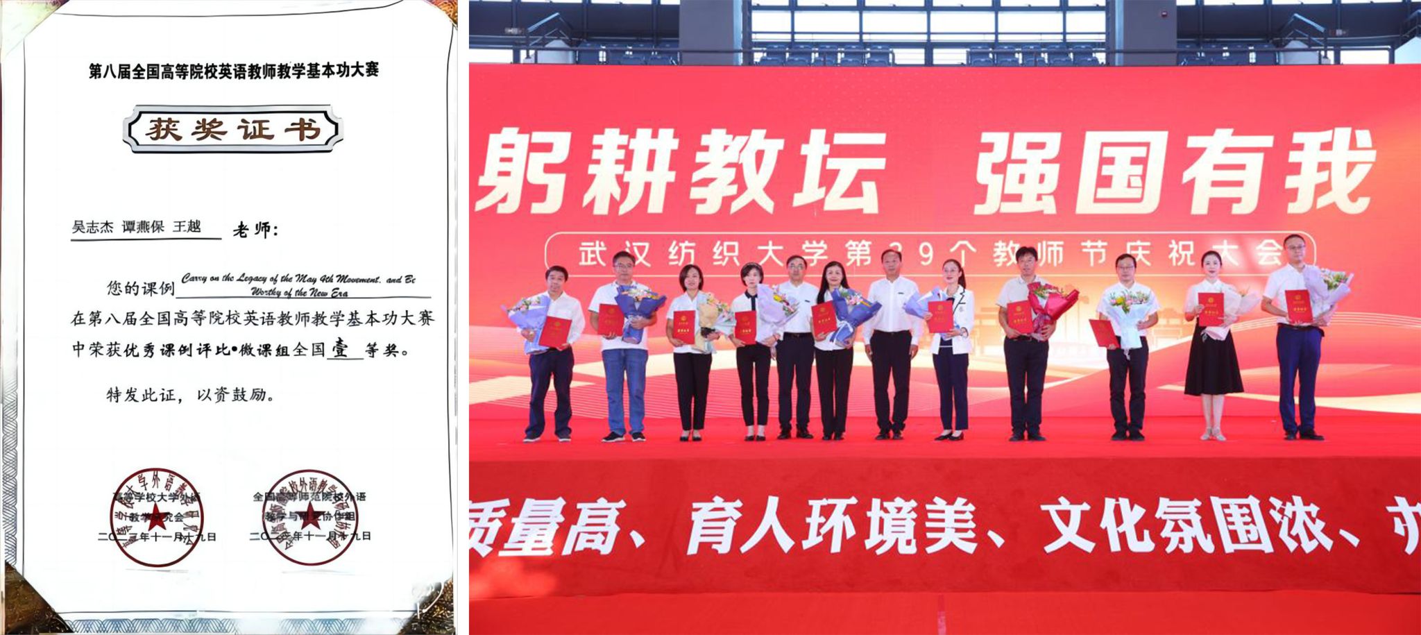五、首次荣获第八届全国高等院校英语教师教学基本功大赛全国一等奖、三等奖各1项、2023年全国高校外语课程思政教学案例大赛全国一等奖1项,连续3年获评公司“最美教师”1名,公司教师能力获得新提升。9月,公司印发《关于表彰永利集团2023年“最美教师”“最美纺大人”获奖人选的决定》,吴卉获评“最美教师”;10月,外语教学与研究出版社公布2023年全国高校外语课程思政教学案例大赛获奖名单,谭燕保荣获一等奖;11月,第八届全国高等院校英语教师教学基本功大赛在浙江工业大学举行,吴志杰荣获一等奖、吴凤竹荣获三等奖。
