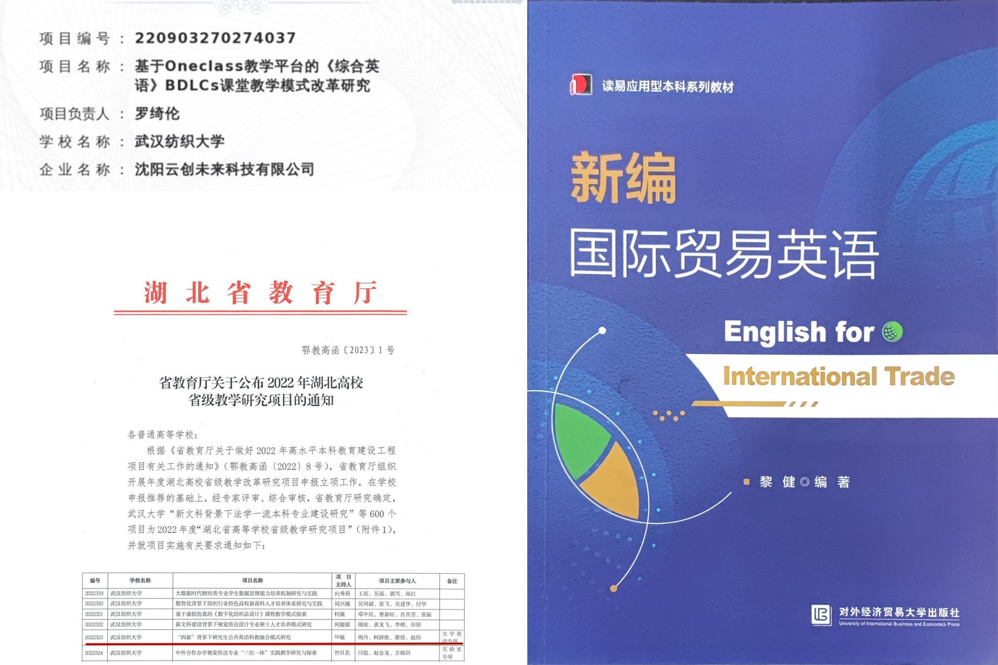 四、连续获批教育部产学合作协同育人教学改革研究项目2项,获批湖北省省级教学改革研究项目1项,出版应用型本科系列教材1本,公司教学改革及教材建设取得新成效。2月,湖北省教育厅发布《省教育厅关于公布2022年湖北高校省级教学研究项目的通知》,华敏主持《“四新”背景下研究生公共英语科教融合模式研究》获得立项;12月,教育部发布《教育部高等教育司关于公布2023年产学合作协同育人项目立项名单的通知》,罗绮伦主持《基于Oneclass教学平台的〈综合英语〉BDLCs课堂教学模式改革研究》和刘雅婷主持《产学协同“语言、思辨、素养”三元融合的混合式大学英语优质课程建设》获批立项;12月,对外经济贸易大学出版社出版黎健主编读易应用型本科系列教材《新编国际贸易英语》。