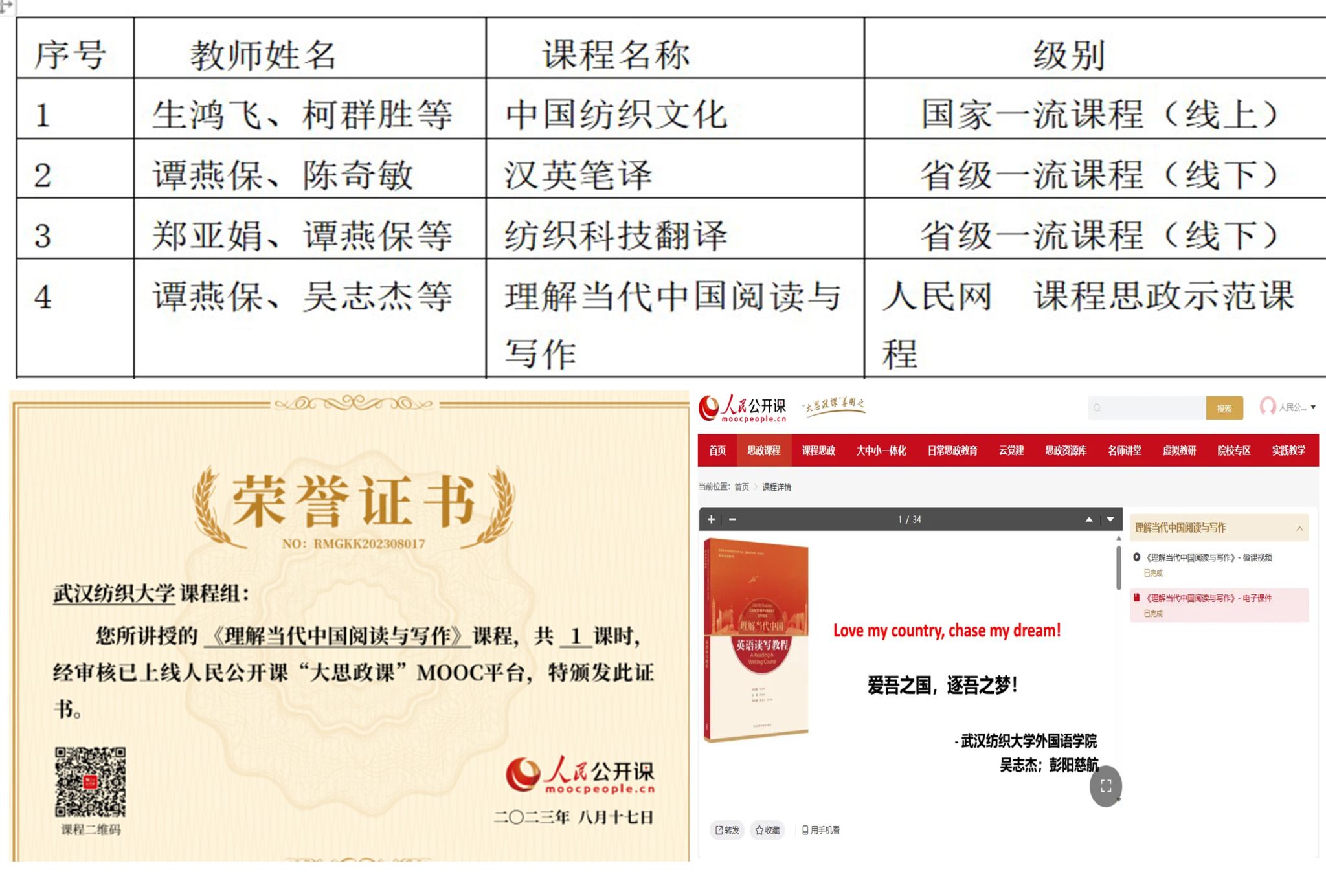 三、连续2年获批湖北省省级线下一流课程1门,《理解当代中国阅读与写作》课程荣列人民网“人民公开课大思政示范课”,公司课程建设取得新进步。9月,《理解当代中国阅读与写作》课程成功上线人民网-人民公开课,荣列人民网“人民公开课大思政示范课”;11月,省教育厅印发《关于公布2023年度省级一流本科课程认定结果的通知》,郑亚娟主持《纺织科技翻译》课程获批2023年度省级线下一流课程。