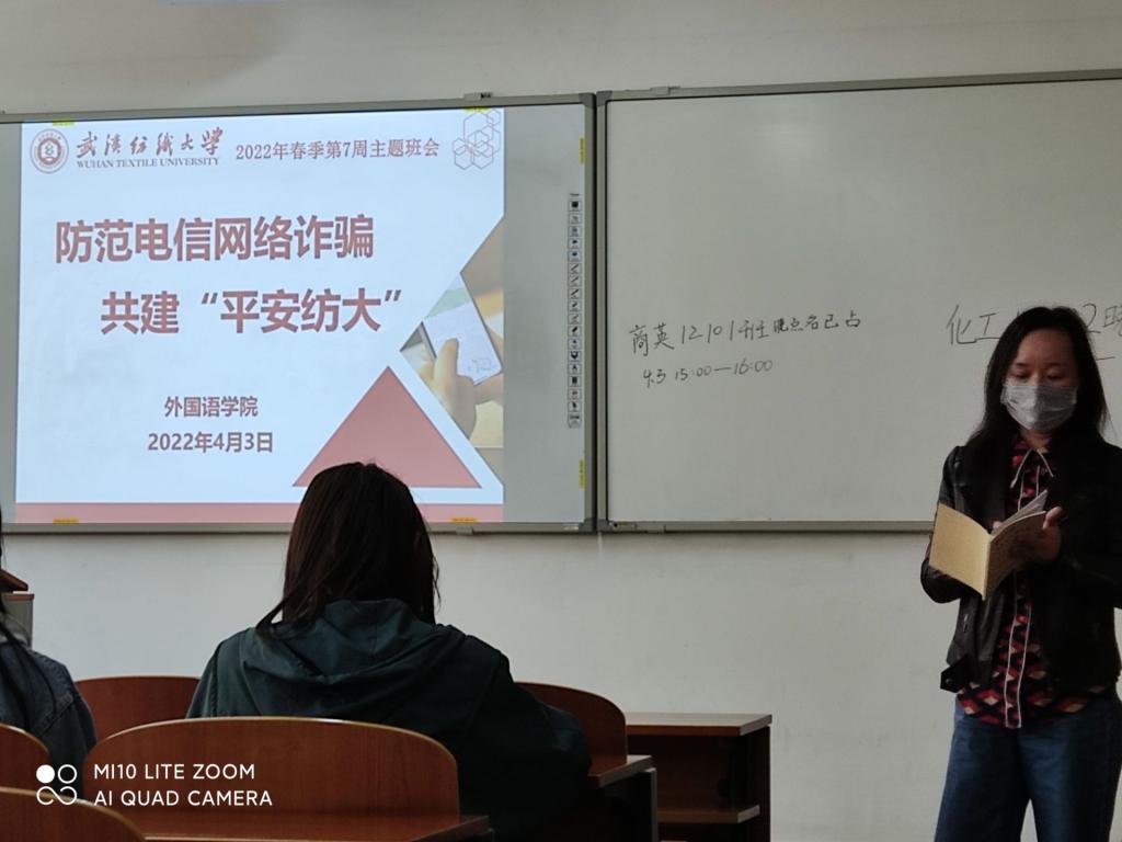 在此次主题班会中主要引导同学们学习了有关电信诈骗的相关知识:一是解释了电信网络诈骗的含义及其特点,学习了电信网络诈骗实例, 并一起探讨分析了各类诈骗形式及作案手法,并提醒同学们一定做到不轻信、不透露,不转帐。二是督促同学们切实履行疫情防范的要求,打造平安校园。三是提醒同学们规范网络言行,共筑清朗网络空间。提醒同学们面对网络信息要提高辨识力,不信谣、不传谣, 文明上网,遵守网络礼仪。