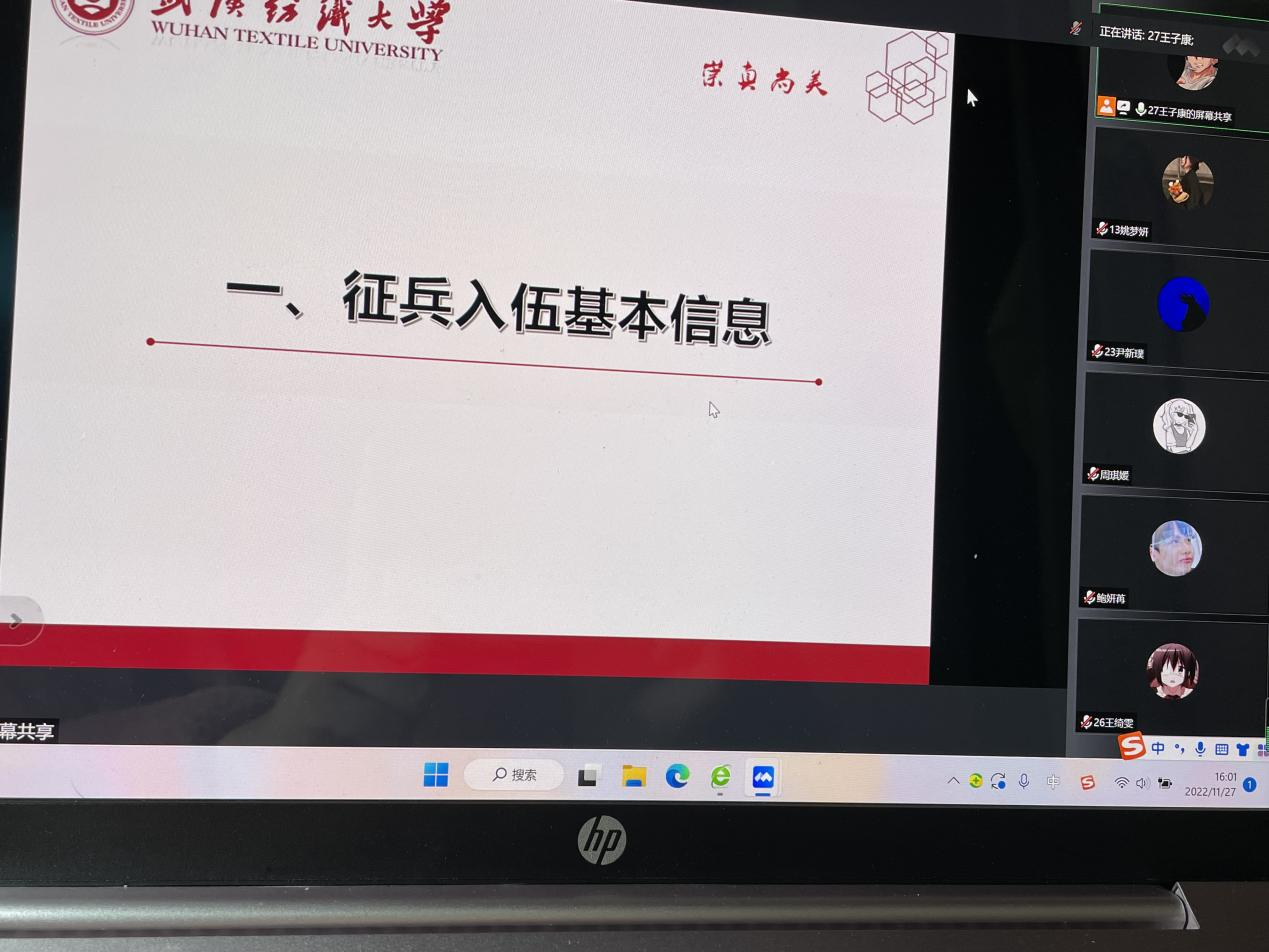 首先,老师先介绍了关于老员工征兵入伍的相关通知,包括部队简介、入伍条件、老员工参军特别优惠政策、军营生活等,并特别强调有参军意向的同学小心征兵诈骗。“参军将是改变参军的同学们人生的经历。”老师鼓励同学们,尤其是有意向参军的同学积极关注有关老员工参军入伍的有关信息,勇当强军重任,书写灿烂青春。