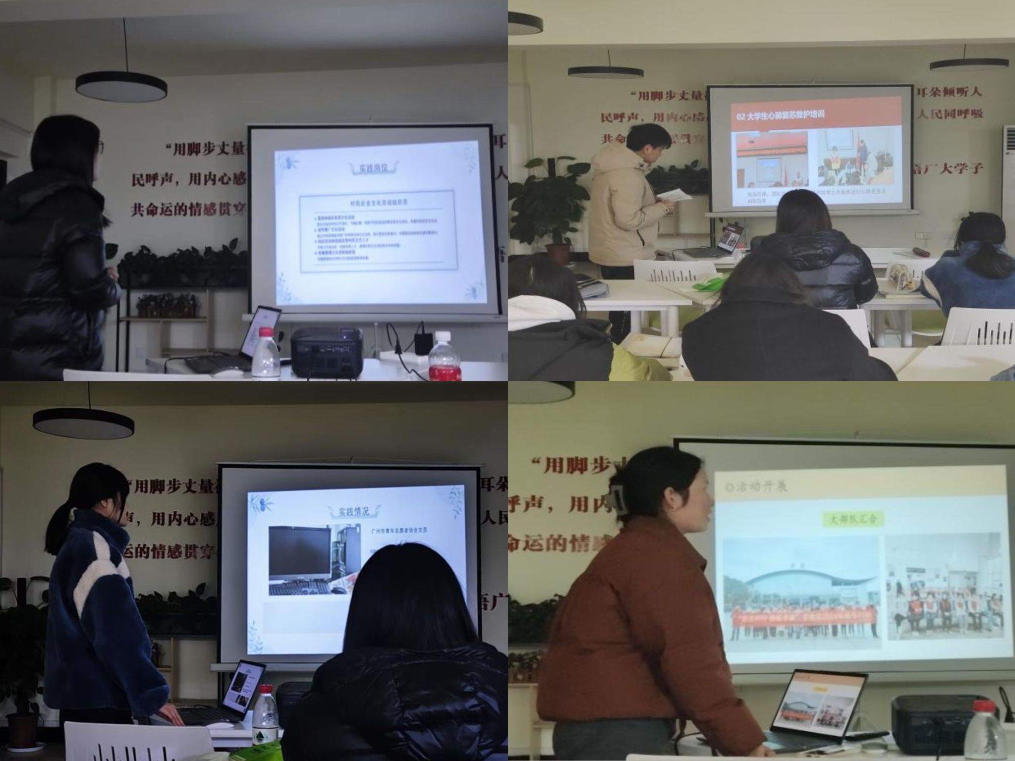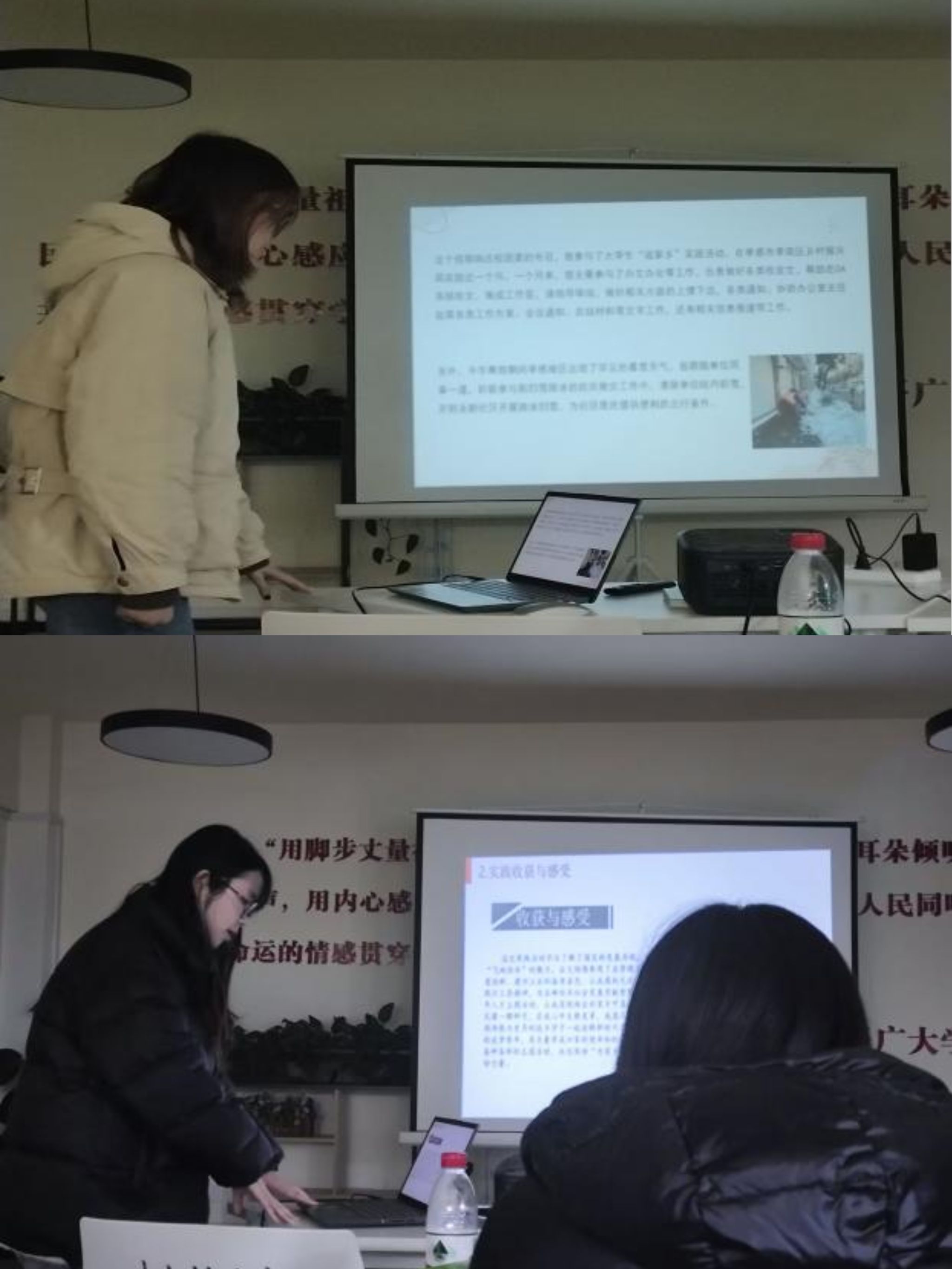 活动伊始,7名参与实践的同学依次介绍了自己寒假实习的经历和自己的感悟。英语12301班邹佳同学分享自己在老家孝感市火车站参与的“暖冬心动”,主要工作内容是维持旅客进出站秩序,为旅客提供指引、咨询等帮助,并为旅客提供热水、药品等。这次活动令邹佳收获颇多,她直言,“成为志愿者是自己从小的向往,梦想着能为社会尽自己的微薄之力”。英语12101班李金牒同学展示了自己在家乡五峰参加笔试考试,参观五峰民族工业园、劳模工匠馆和贸易物流园,参加座谈交流会和寒假课堂等实践内容。她感言,“家乡的变化让我感到无比骄傲,作为新时代青年,我将发挥专业优势和特长,为家乡发展尽一份力”。英语12202班李灵熙同学对自己在家乡孝感市孝南区乡村振兴局的实践活动做出分享。她主要参与办文办会工作,负责各类收发文和辅助办公室主任进行文字工作。此外,她还跟随单位同事外出除冰扫雪,为社区居民提供便利的出行条件。在此次活动中,她积累了不少工作经验,也认识到自己在沟通等方面的不足。英语12302班谢中盛同学分享了自己在家乡荆州市图书馆的实践经历,包括图书整理与上架编排、老员工心肺复苏救护培训和创文洁城活动。通过这次活动,他认识到培养奉献意识、提高实践本领和发扬团队协作精神的重要性。商英12201叶羽洁同学介绍了她在家乡仙桃市沙嘴办事处叶河社区村委会参加的“七彩课堂”活动。与其他分享者不同的是,她从公司的“七彩课堂”志愿活动中汲取灵感,一手策划并全程参与了此次活动,从招募志愿者到制定课程表、准备教室和教学用具再到开展课程并定期评估。分享时,她感慨“自己收获了志同道合的朋友,浅尝教育之道,人生阅历这本书又多写了一面”。商英12201班李安羽同学对其在家乡广州市青年志愿者协会的文员工作作出交流。她协助完成项目策划、新媒体运营、办公文书以及广东智慧团建系统运营等工作。此外,她还分享了自己参加大赛的实践经历和线上下实习经历。实践活动“锻炼和提升工作态度与责任心”,也让她“对未来职业规划有了更清晰的认识”。
